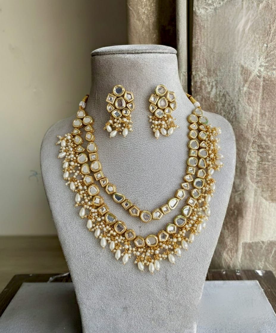 This jewelry set features a traditional Indian design, typically worn for weddings, parties, and festive occasions. It includes a double-layered necklace and a pair of matching stud earrings. The design incorporates prominent, irregularly shaped stones (kundan) surrounded by smaller white pearls.