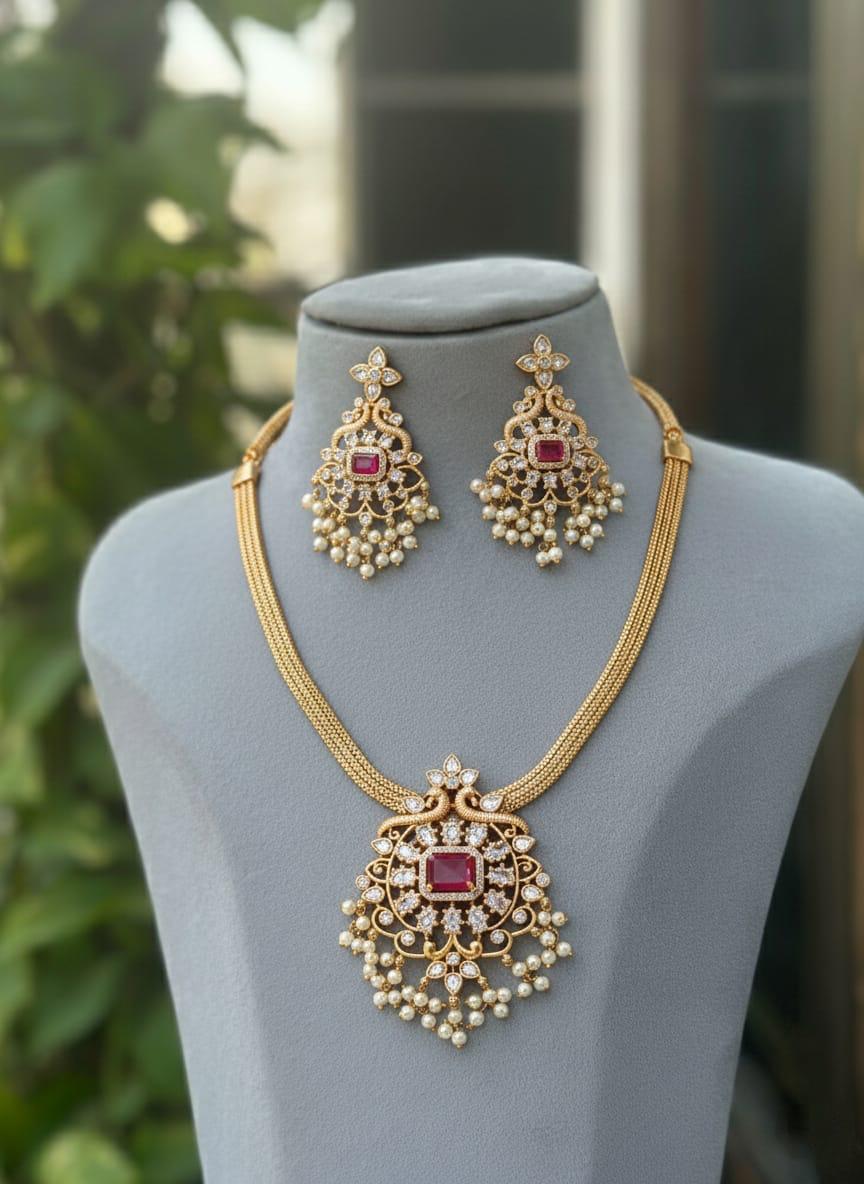 This Mahika Kemp and AD Stones Attigai Necklace Set is a stunning blend of traditional elegance and contemporary craftsmanship, making it a versatile accessory for various occasions. The deep red Kemp stones offer a rich, vintage charm reminiscent of classic South Indian heritage, while the brilliance of the American Diamond stones provides a subtle yet regal shimmer. The combination of the vibrant stones, lustrous gold finish, and pearl embellishments creates a striking visual contrast. This type of jewelry is highly popular for festive occasions, weddings, and cultural events, and beautifully complements traditional outfits like sarees and lehengas.