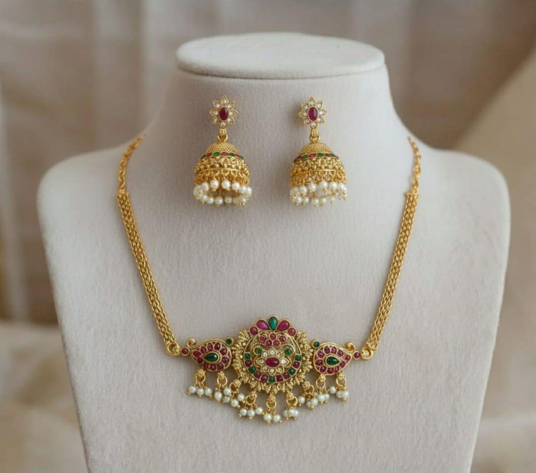 Accents: Features small white pearl drops on both the choker and the matching jhumka earrings