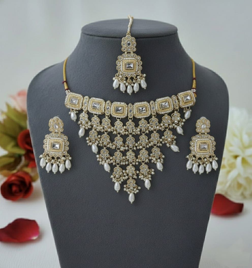 Materials: The set is crafted from a skin-friendly metal alloy with premium Kundan/Polki stonework and white faux pearls. The stones and beads used are artificial, typically fiber or glass-based.
